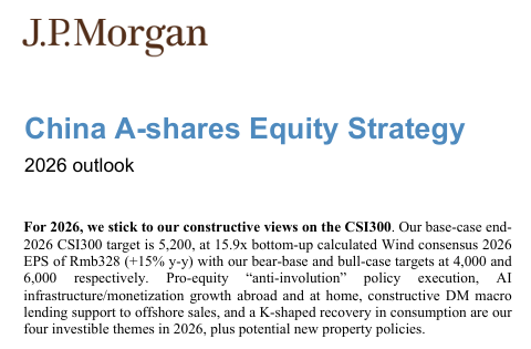 此外,上海证券报27日获悉,摩根大通中国股票策略团队发布2026年展望报告。展望2026年,该机构保持对沪深300指数的建设性看法。基准情景下,其对2026年底沪深300指数的目标点位预测为5200点,较11月24日收盘价存在17%的潜在上行空间。悲观情景和乐观情景下,该机构的目标点位分别为4000点和6000点。